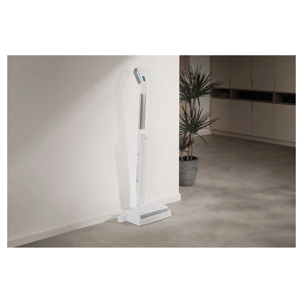 Az eszköz ergonomikus kialakításának és mindössze 2,8 kg-os súlyának köszönhetően egyszerűen mozgatható, még szűk vagy nehezen hozzáférhető helyeken is, például falak mentén vagy bútorok alatt. A három külön tartály – tiszta víz, szennyezett víz és szilárd szennyeződések számára – garantálja, hogy a padló mindig friss vízzel legyen tisztítva, miközben a szennyeződés külön kerül eltávolításra, ezzel is növelve a hatékonyságot és higiéniát.