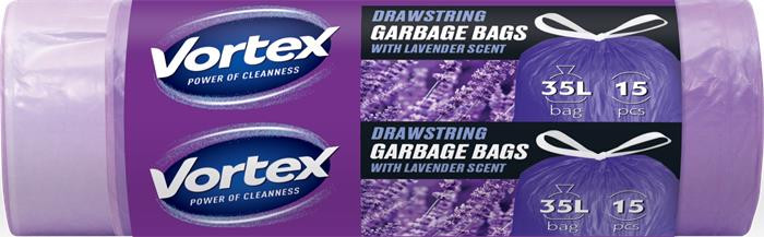 VORTEX Szemeteszsák, zárószalagos, 35 l, 15 db, 50x60 cm, HDPE, 15 µ, VORTEX, levendula illattal