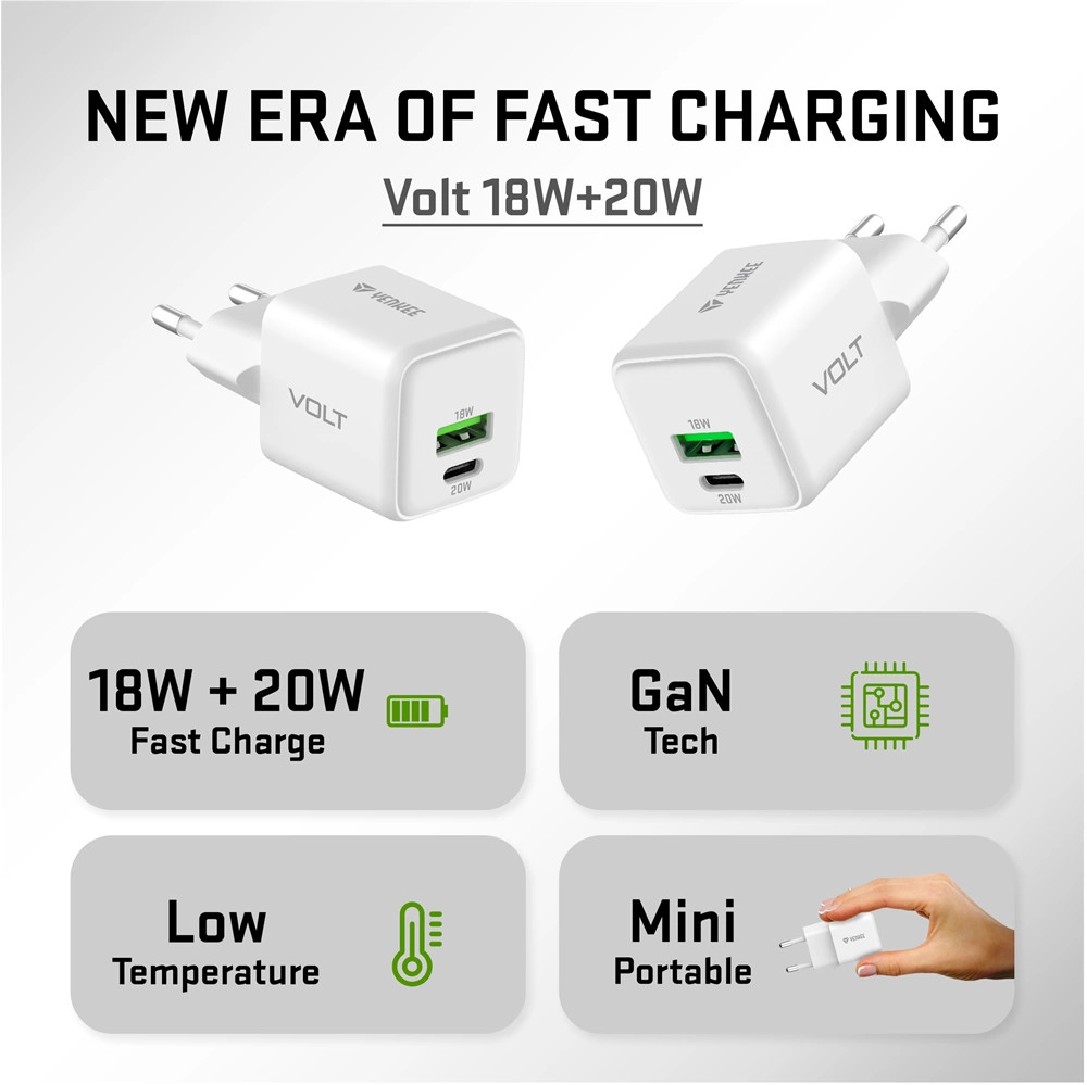 A GaN VOLT töltő nagy teljesítményt, kompakt méretet és sokoldalú használatot kínál. A mobileszközök gyors és biztonságos töltéséről két USB C kimeneti csatlakozó gondoskodik, amelyek maximális teljesítménye 20 W, és támogatják a QC 4.0+, PD 3.0, AFC, FCP és egyéb töltési protokollokat.
