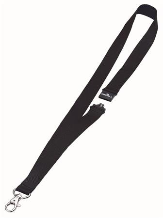 Biztonsági kioldóval ellátott nyakba akasztható textil szalag, kihúzható tartóval.