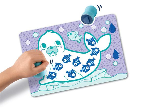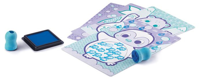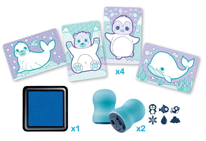 Légy kreatív: nyomdát minden gyermek kezébe! nyomdakészlet kisgyermekek számára 2 éves kortól ajánlott bálna, fóka, medve és pingvin figura a doboz tartalma: 4 db foglalkoztató lap 1 db kék bélyegzőpárna 2 db nyomda víz témájú mintákkal