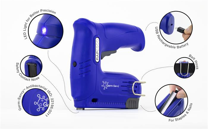 RAPESCO Tűzőpisztoly, vezeték nélküli, elektromos, USB, RAPESCO Germ-Savvy "T12-USB", kék