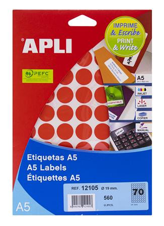 APLI Etikett, 19 mm kör, színes, A5 hordozón, APLI, piros, 560 etikett/csomag